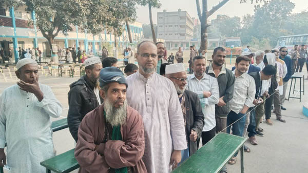 During visits to several polling stations in Rajshahi city, a steady stream of voters was observed lining up to cast their ballots shortly after polling started.