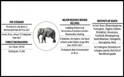 In the last 20 years, at least 153 elephants have died in the country, according to forest department’s data and records by this newspaper. Experts say that forest encroachers’ adoption of this lethal technique threatens to wipe out the gentle giants across the Cox’s Bazar and Chattogram ranges within a generation.