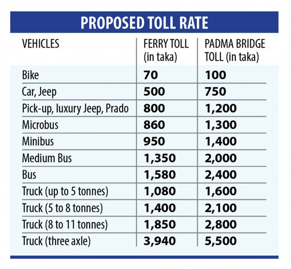 A bike on the bridge would have to pay Tk 100, while on ferry it would pay Tk 70. A minibus on the bridge would pay Tk 1,400, while on the ferry Tk 950.